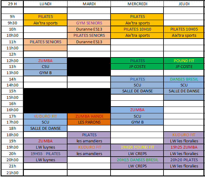 Lundi 11h pilates – complexe sportif Henry Michel Mardi 9h30 renforcement musculaire – salle Arbois Duranne Mardi 10h30 pilates – salle Arbois Duranne
